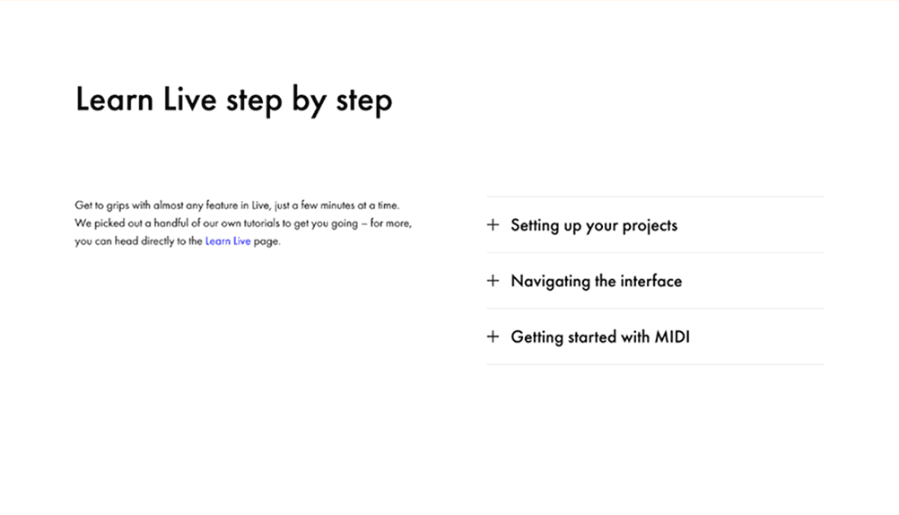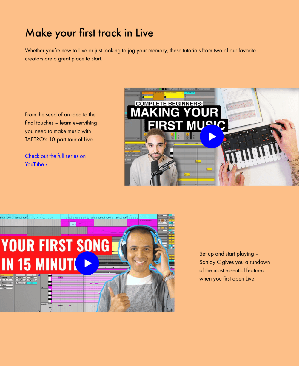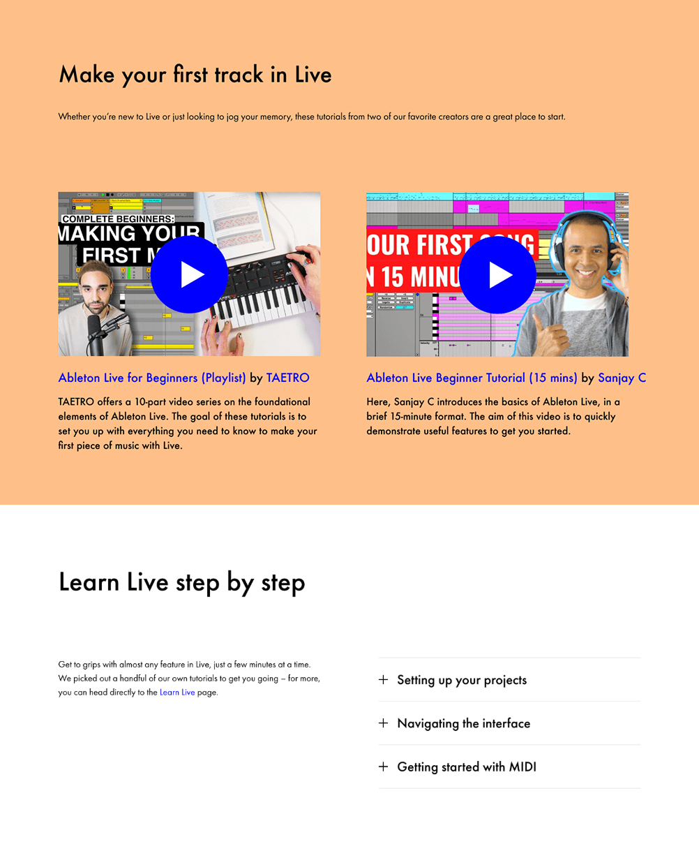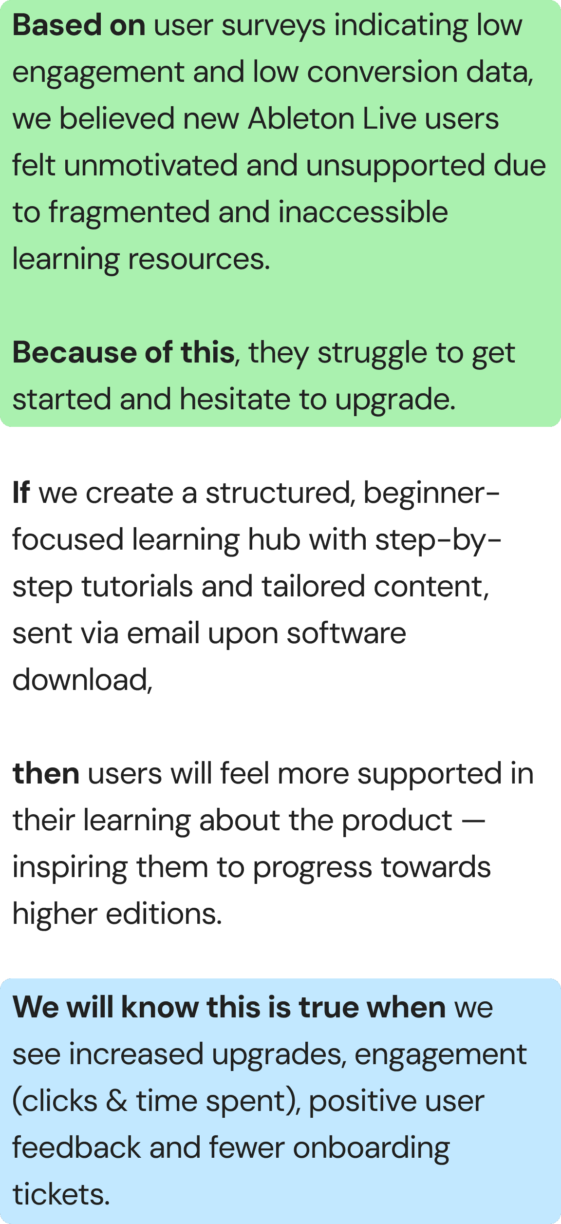 This project aimed to Improve onboarding of beginner music makers into Ableton products. As the in-house UX/UI designer, I led the end-to-end design process, creating a dedicated resource page with step-by-step tutorials and guides to help new users build confidence and maximise their experience with the flagship software.